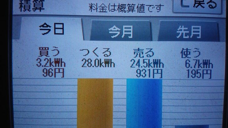 パナソニックHIT240 5kW2020/5/1の太陽光発電量 28.0kWh月…