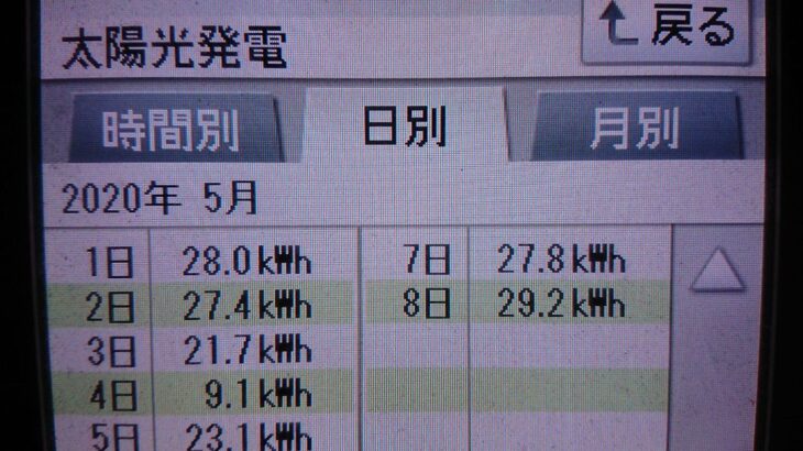 パナソニックHIT240 5kW2020/5/7の太陽光発電量 27.8kWh月…