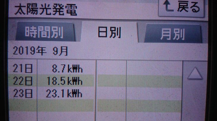 パナソニックHIT240 5kW2019/9/19の太陽光発電量 22.5kWh…