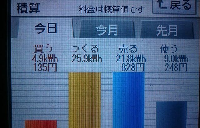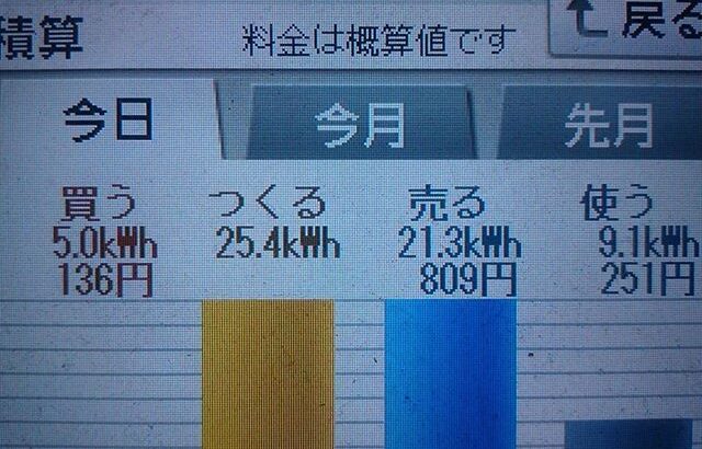 パナソニックHIT240 5kW 2018/7/9の太陽光発電量 25.4kWh…