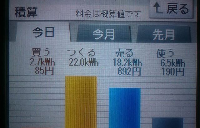パナソニックHIT240 5kW 2018/6/1の太陽光発電量 22.0kWh…