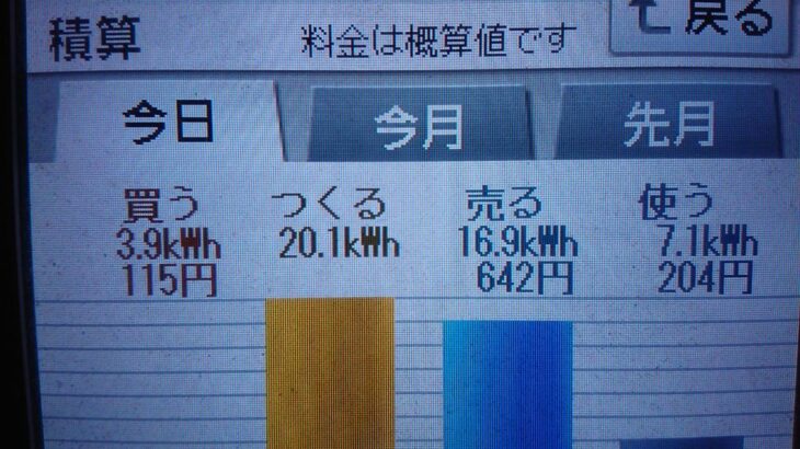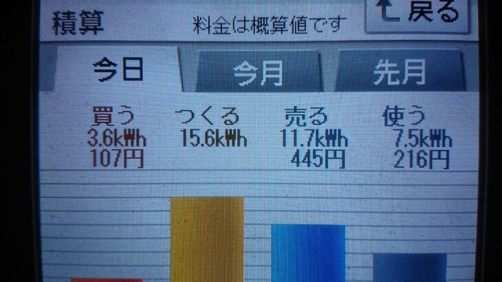 パナソニックHIT240 5kW2020/4/16の太陽光発電量 15.6kWh…