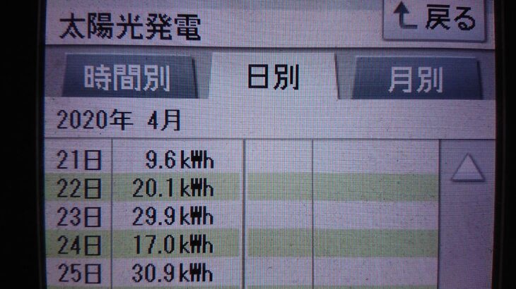 パナソニックHIT240 5kW2020/4/25の太陽光発電量 30.9kWh…