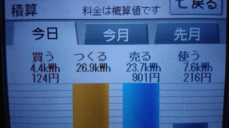 パナソニックHIT240 5kW2019/10/9の太陽光発電量 26.9kWh…