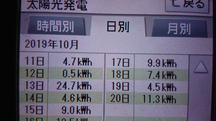 パナソニックHIT240 5kW2019/10/11の太陽光発電量 4.7kWh…