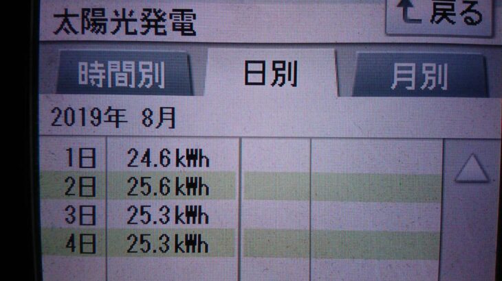 パナソニックHIT240 5kW2019/8/2の太陽光発電量 25.6kWh月…
