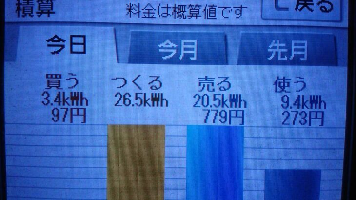 パナソニックHIT240 5kW2019/8/8の太陽光発電量 26.5kWh月…