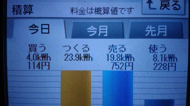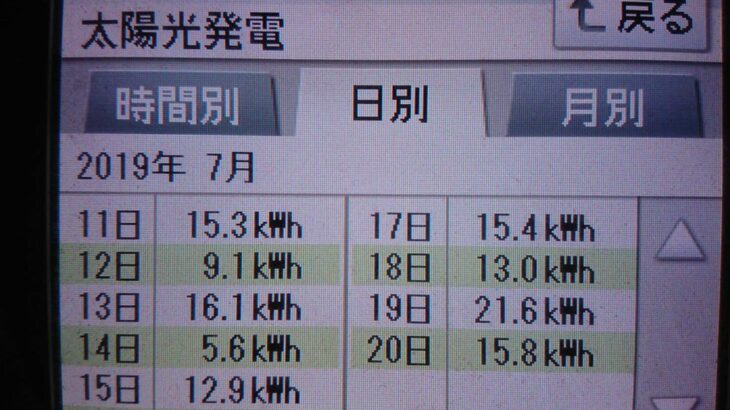 パナソニックHIT240 5kW2019/7/19の太陽光発電量 21.6kWh…
