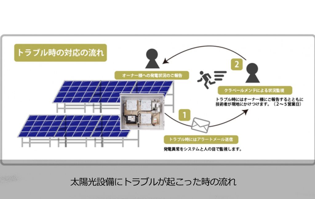 さらに発電量監視システムを設置すれば定期点検や日常点検までの期間に不具合が放置される事を防ぐことも出来ます。近年はこの監視システムが設置されるケースも多いのですが、発電量の異常が検知されたときに販売施工会社と太陽光発電設置者の双方にアラートが届くので故障にすぐさま気づく事が出来ます。