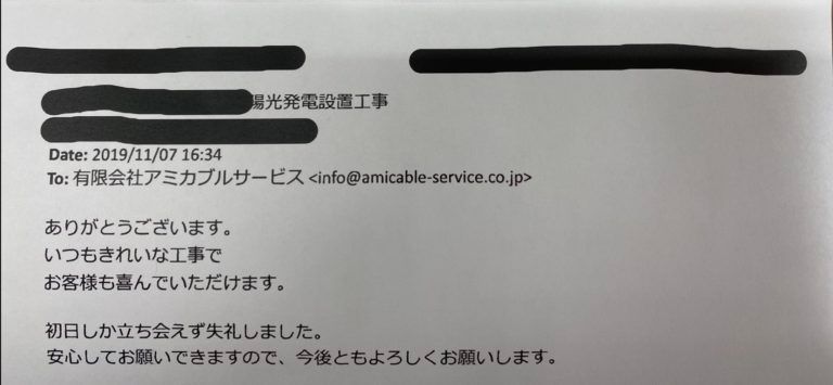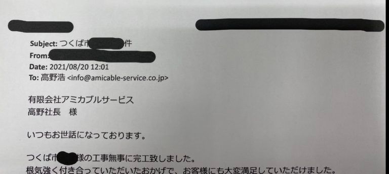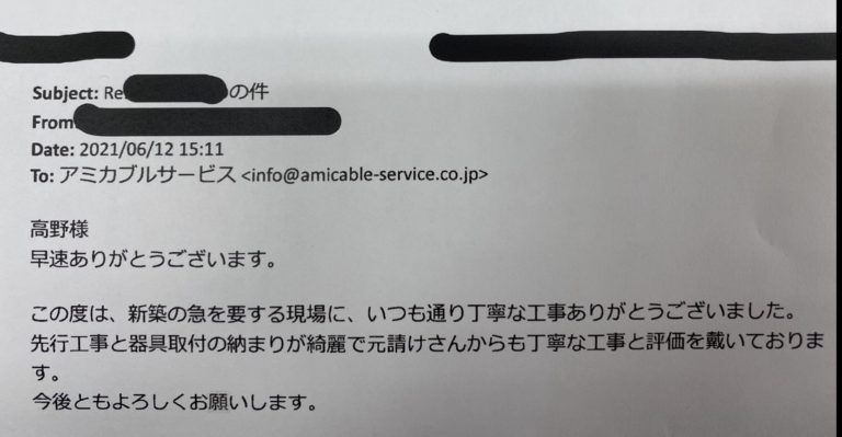 お仕事が完了した折には、お取引担当者様から写真の様なお礼のメールを頂戴することもあり、やりがいと喜びを感じます。