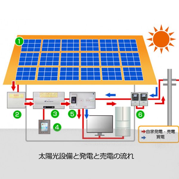 下のイラストは太陽光設備一つ一つと発電・売買電の流れを説明したものです。