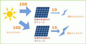 太陽光発電における変換効率とはパネルから日光を受けて電力へ変換する際にどれだけの電力に変換できるかという数値を意味しています。当然この変換効率は高ければ高いほど多くの電気を生成出来る事になります。