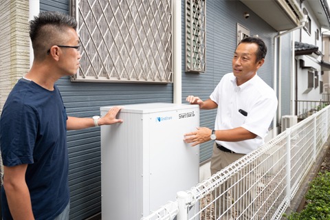 アミカブルさんのチラシがきっかけです。そのチラシは、売電価格の10年固定が終わってしまうので、対策した方が良いという内容でした。興味があったのでアミカブルさんに電話すると、とりあえず会社にお見えになりませんかと誘われました。電話でも説明するけど電話では分からない部分もあるので、一度会社に来て話した方が絶対に良いと。そこで会社にお伺いすると、1kWhあたり48円の固定が終わると8.5円にまで下がることを教えてくれたんです。そこで初めて蓄電池の話が出るんです。蓄電池を入れると、何より災害時に良いと。例えば、停電になってもすぐに電源が回復する。それと、電気代の節約にも繫がるという話でした。それからすぐに家に来てもらい、もう一度妻と話を聴き、契約しようということになりました。